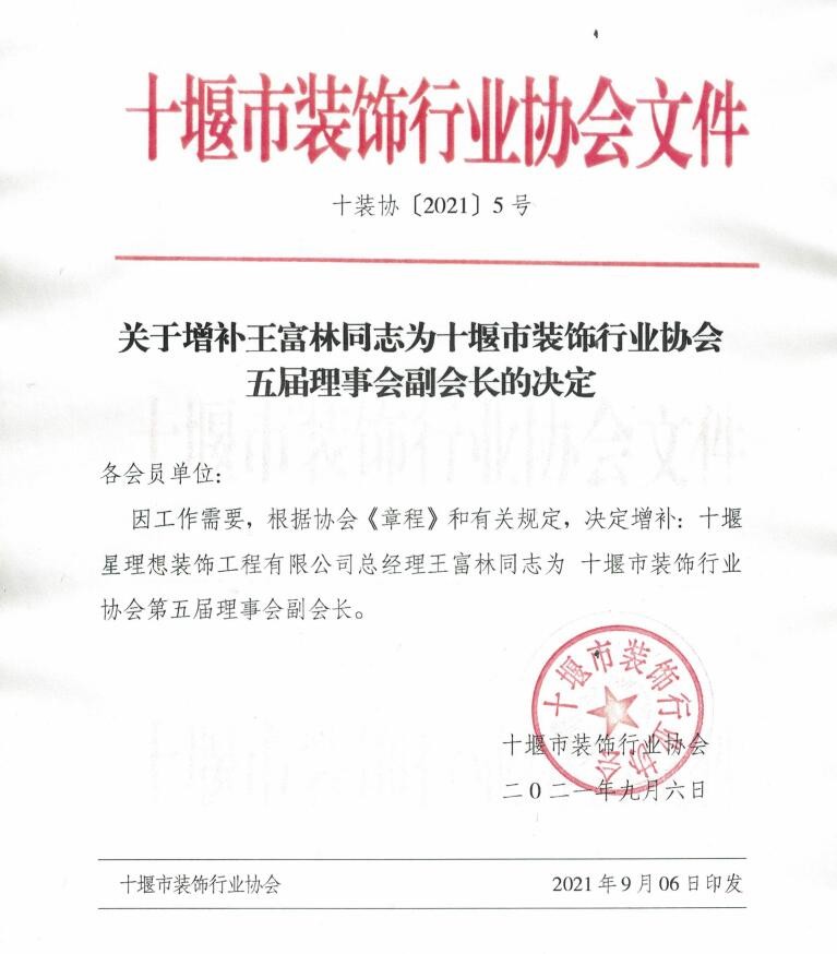 上一篇:关于增补卓喜同志为十堰市装饰行业协会五届理事会副会长的决定 下一篇:十装协〔2021〕6号文件——关于吴茂宝同志任十堰市装饰行业协会五届理事会会长的决定